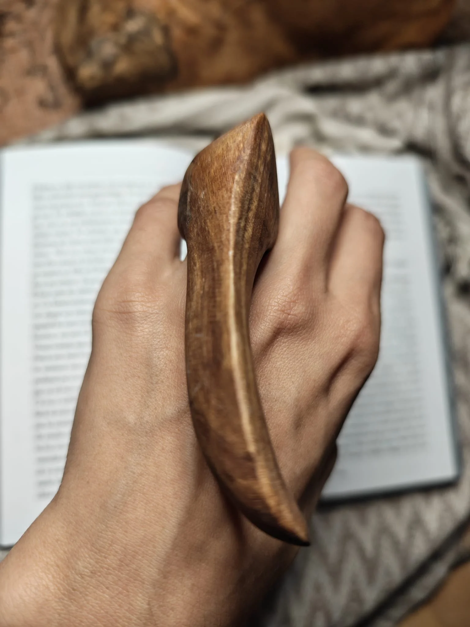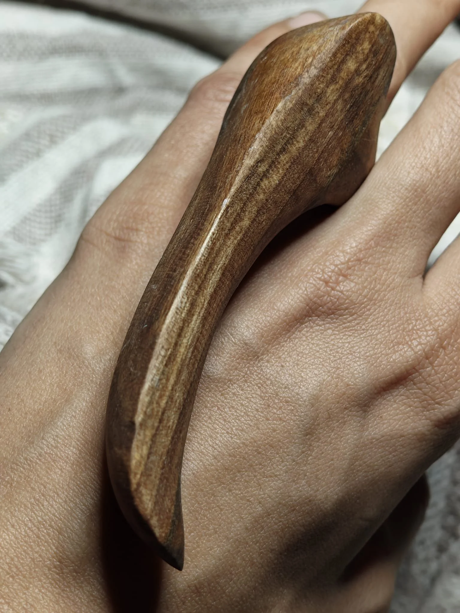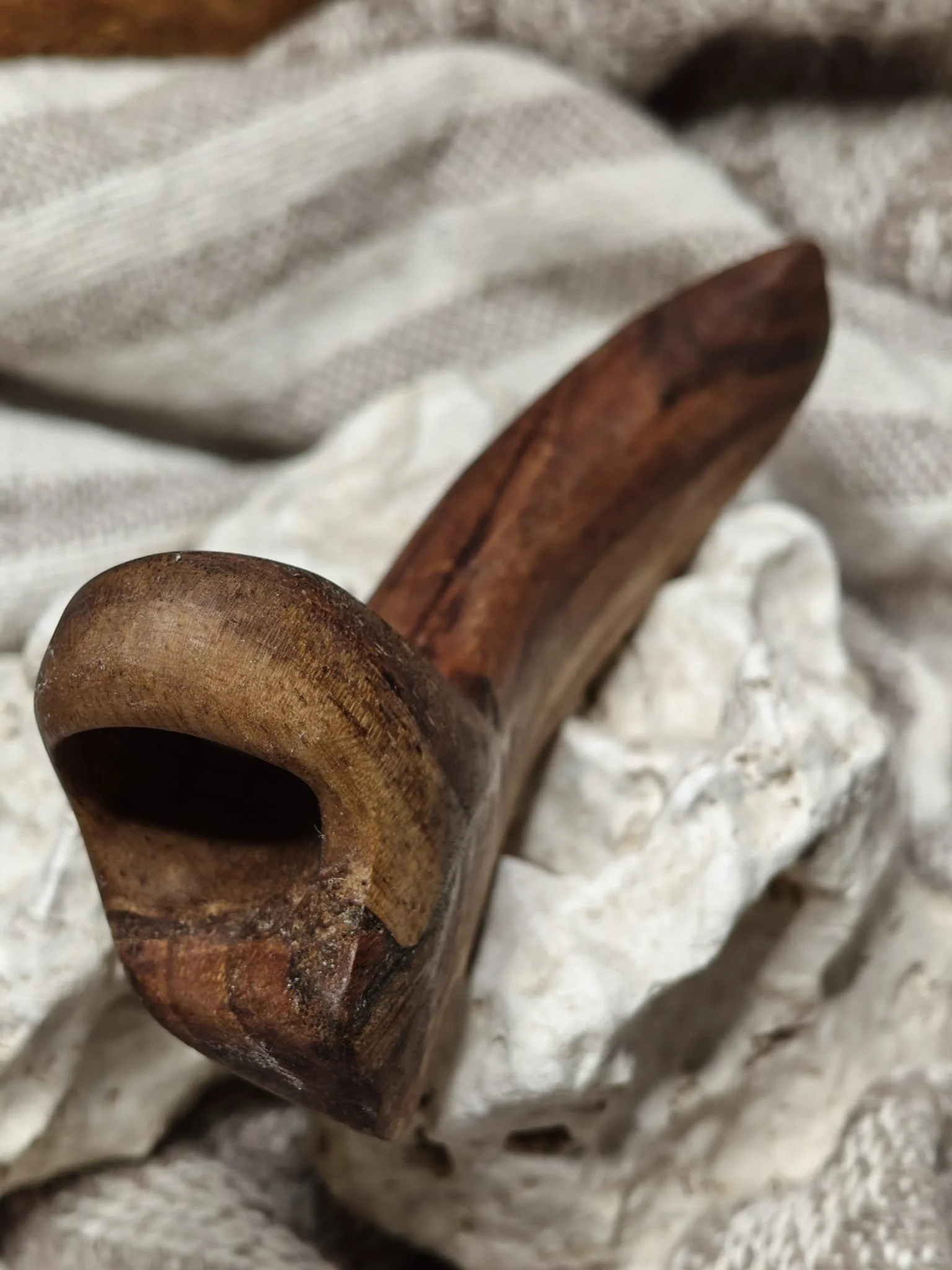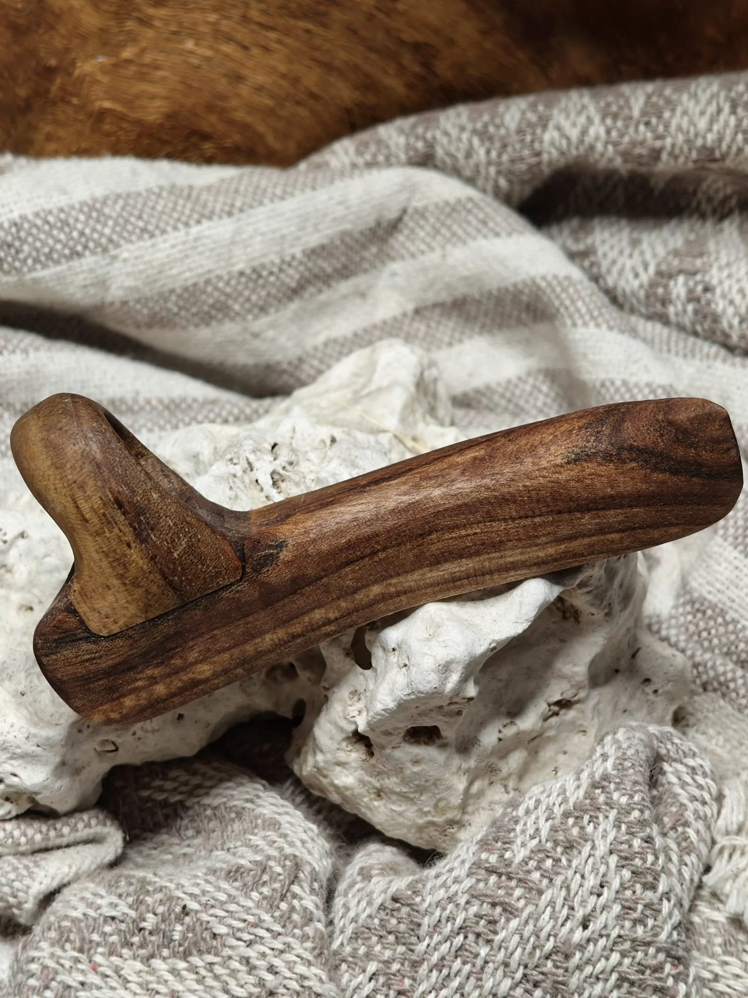 Ajunse la mine în atelier, primele sculpturi făcute din ea fac baza unei lămpi de podea. Acele fețe stilizate au produs și ele câteva deșeuri de nuc pe care le-am păstrat. Apoi am făcut o oglindă, cu o ramă organică și fluidă, care s-a vândut imediat. Apoi niște prieteni și-au dorit o consolă pentru canapea, unde să își pună o carte, un pahar. Cam dintr-o ușă întreagă mi-a ieșit o piesă utilă și a mai rămas ca rest zona găurită pentru mânere și încuietoarea, așa că le-am pus deoparte și pe ele.