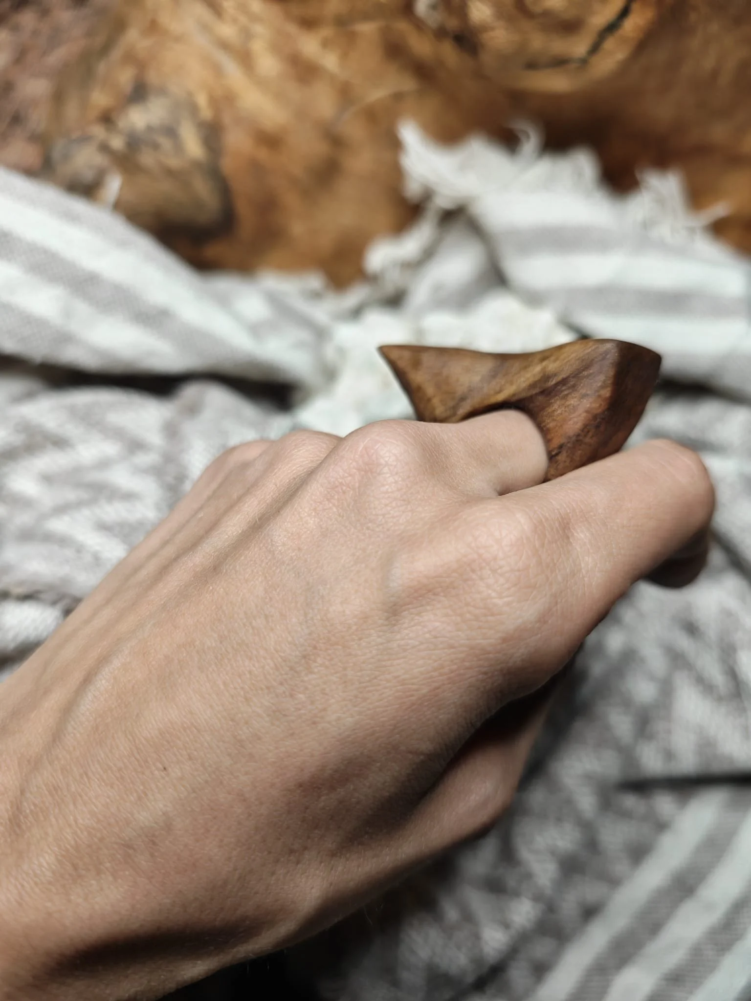 Ajunse la mine în atelier, primele sculpturi făcute din ea fac baza unei lămpi de podea. Acele fețe stilizate au produs și ele câteva deșeuri de nuc pe care le-am păstrat. Apoi am făcut o oglindă, cu o ramă organică și fluidă, care s-a vândut imediat. Apoi niște prieteni și-au dorit o consolă pentru canapea, unde să își pună o carte, un pahar. Cam dintr-o ușă întreagă mi-a ieșit o piesă utilă și a mai rămas ca rest zona găurită pentru mânere și încuietoarea, așa că le-am pus deoparte și pe ele.