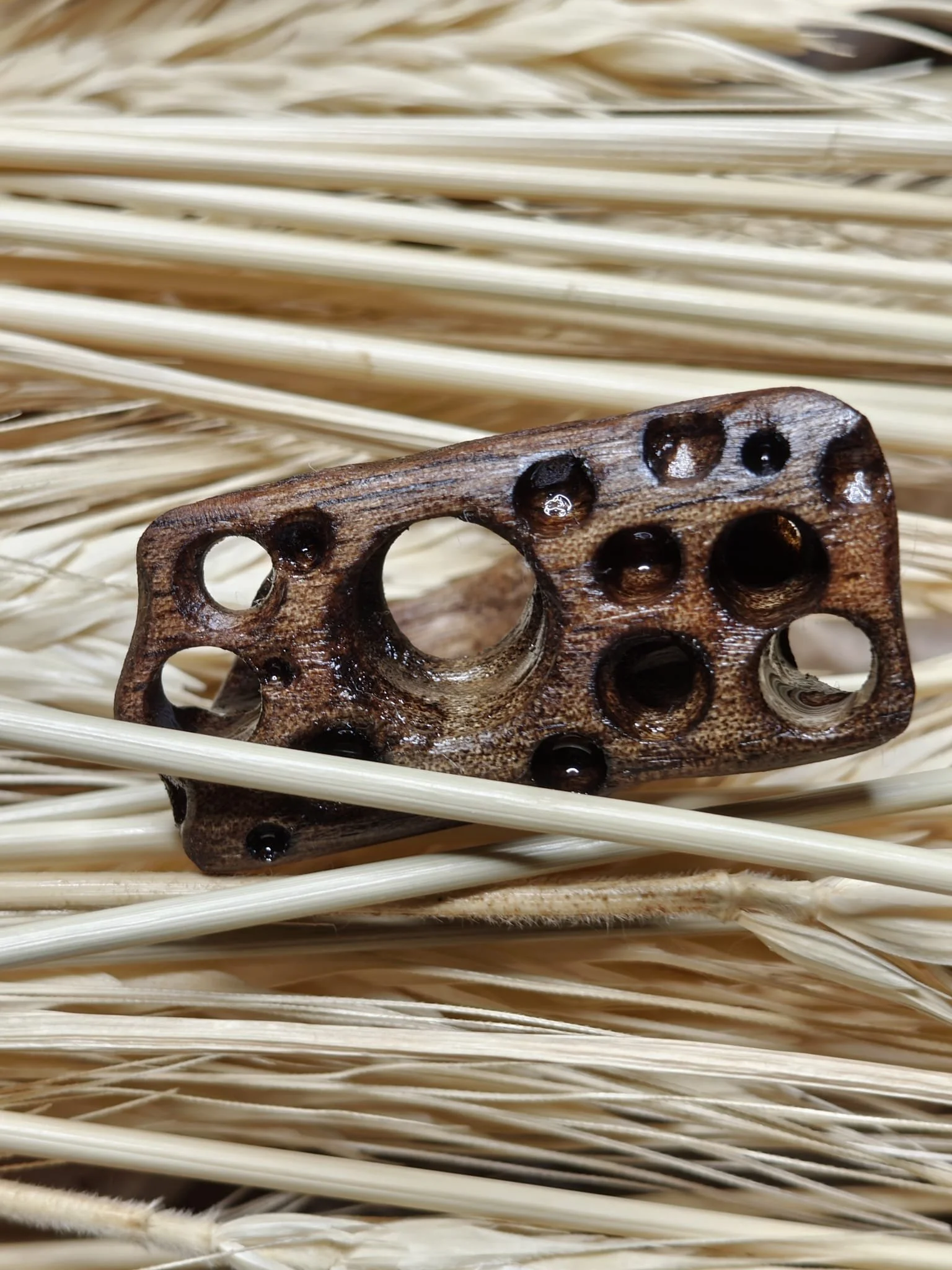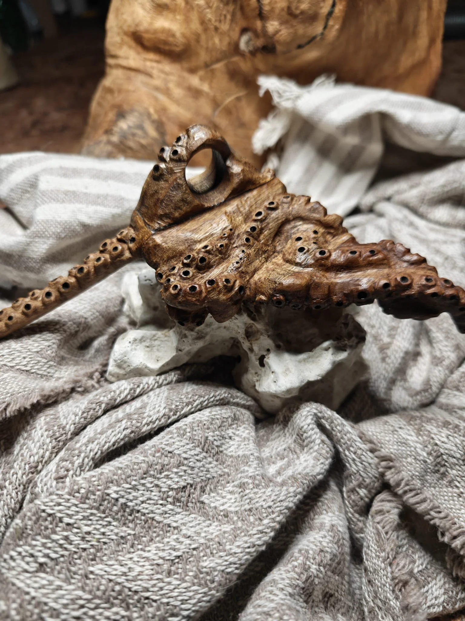Ajunse la mine în atelier, primele sculpturi făcute din ea fac baza unei lămpi de podea. Acele fețe stilizate au produs și ele câteva deșeuri de nuc pe care le-am păstrat. Apoi am făcut o oglindă, cu o ramă organică și fluidă, care s-a vândut imediat. Apoi niște prieteni și-au dorit o consolă pentru canapea, unde să își pună o carte, un pahar. Cam dintr-o ușă întreagă mi-a ieșit o piesă utilă și a mai rămas ca rest zona găurită pentru mânere și încuietoarea, așa că le-am pus deoparte și pe ele.
